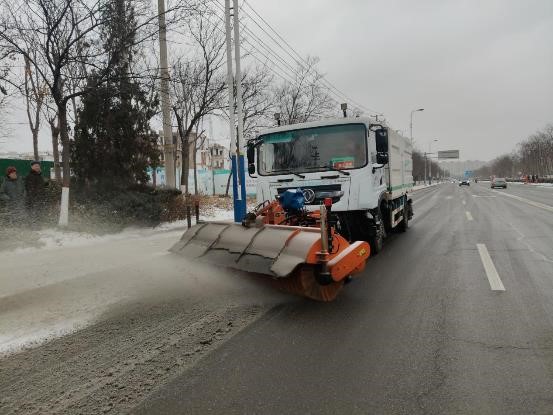 公司迅速集結23名工作人員,調配除雪車、融雪劑灑布車各1臺,前往渤海十三路(黃河一路至黃河二路段)開展開除雪作業(yè)。